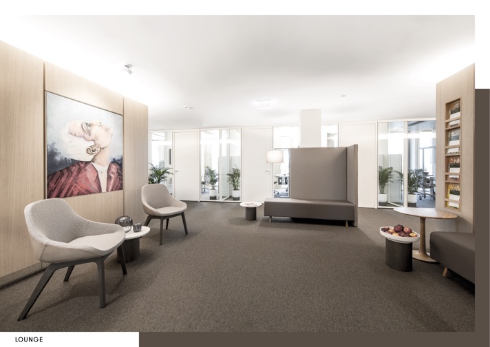 Den inneren, von der Architektur vorgegebenen, Kern umfängt eine multifunktionale Holzwand, die die Corporate Image Bilder in spektakulären Akustografien in den Raum transformiert. Sie birgt zusätzlich zu ihrer akustischen Wirksamkeit zahlreiche funktionale Elemente wie ein Factsheetregal, einen Mineralwasserspender, Schränke für Akten, Vollholzauszüge für Büromaterial, eine Licht- voute und die Vorstandsgarderoben in selbiger Raumzonierung.