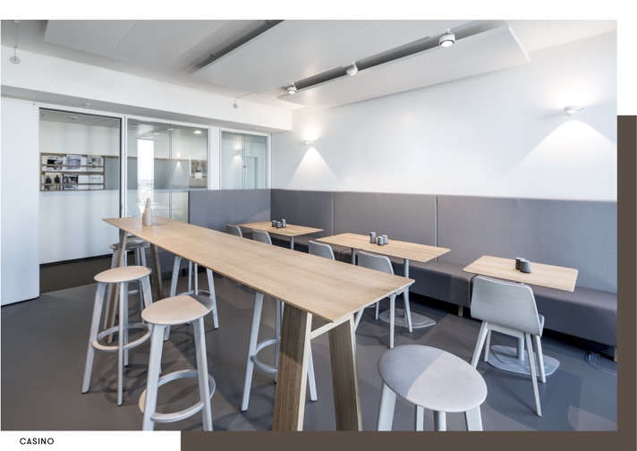 Den inneren, von der Architektur vorgegebenen, Kern umfängt eine multifunktionale Holzwand, die die Corporate Image Bilder in spektakulären Akustografien in den Raum transformiert. Sie birgt zusätzlich zu ihrer akustischen Wirksamkeit zahlreiche funktionale Elemente wie ein Factsheetregal, einen Mineralwasserspender, Schränke für Akten, Vollholzauszüge für Büromaterial, eine Licht- voute und die Vorstandsgarderoben in selbiger Raumzonierung.