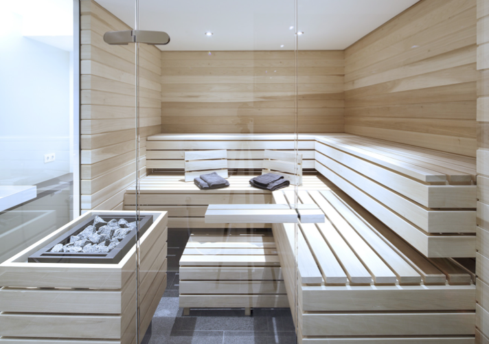 Die Positionierung und Gestaltung der Saunakabine im nur 15 qm großen Häuschen erlaubt Enblicke - Durchblicke - Ausblicke.  Scheinbar schwebende Saunabänke bieten Bewegungsfreiheit und großzügige Verglasungen Aus- und Durchblicke in der spezialangefertigten Kabine.