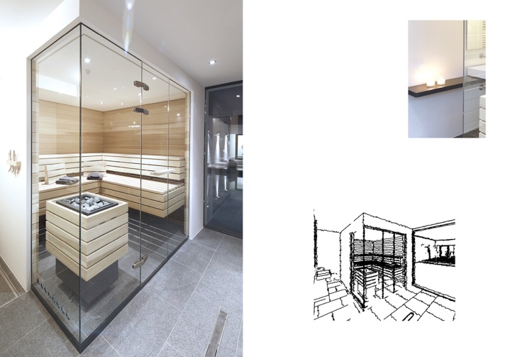 Die Positionierung und Gestaltung der Saunakabine im nur 15 qm großen Häuschen erlaubt Enblicke - Durchblicke - Ausblicke. Scheinbar schwebende Saunabänke bieten Bewegungsfreiheit und großzügige Verglasungen Aus- und Durchblicke in der spezialangefertigten Kabine.