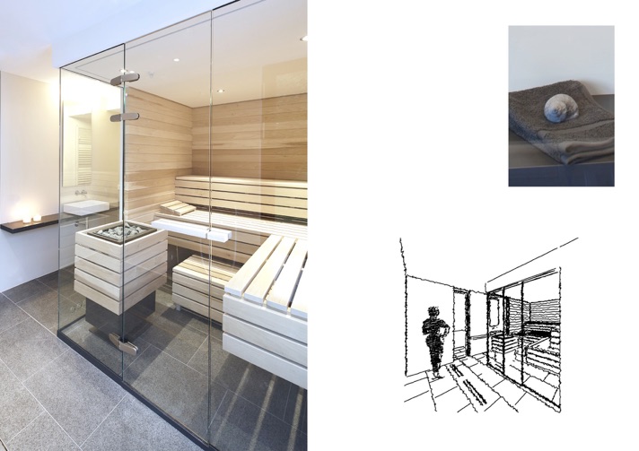 Die Positionierung und Gestaltung der Saunakabine im nur 15 qm großen Häuschen erlaubt Enblicke - Durchblicke - Ausblicke. Scheinbar schwebende Saunabänke bieten Bewegungsfreiheit und großzügige Verglasungen Aus- und Durchblicke in der spezialangefertigten Kabine.