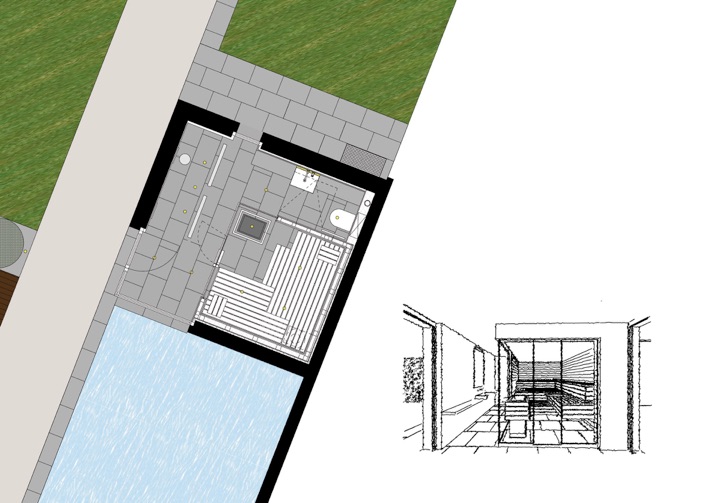 Wer träumt nicht von seinem ganz privaten und persönlichen Wellnessbereich? Die Schwimmbadtechnik des kleinen Pools aus den 70´er Jahren, der das Gebäude im Garten ursprünglich diente, wird durch nachträgliche Unterkellerung unter die Erde verlegt. Im frei gewordenen Erdgeschoss entsteht Raum für eine finnische Sauna samt Dusch-, Abkühlungsbereich und WC.