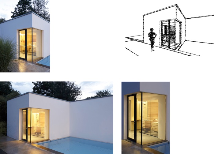Die Positionierung und Gestaltung der Saunakabine im nur 15 qm großen Häuschen erlaubt Enblicke - Durchblicke - Ausblicke. Scheinbar schwebende Saunabänke bieten Bewegungsfreiheit und großzügige Verglasungen Aus- und Durchblicke in der spezialangefertigten Kabine.