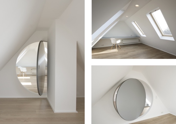 Durch den Umbau, d.h. die Erweiterung der Galerie, und den Ausbau eines Abstellraumes im Spitzboden ist es gelungen, mit einem sehr überschaubaren Budget fast 50qm mehr nutzbaren, sehr licht- und qualitätvollen Wohnraum zu gewinnen. Die Besonderheit des Entwurfs sind zwei Trennwände mit riesiegen kreisrunden Öffnungen.