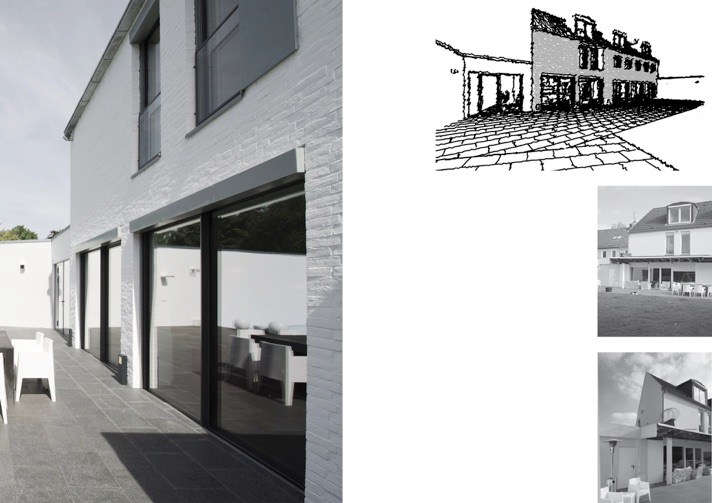 Außen wird die Vormauerklinkerschale des Anbaus ausgetauscht und an das 50´er Jahre-Mauerwerk des ursprünglichen Hauses angepasst. Diese Maßnahme erlaubt eine energetische Sanierung und aus dem angebauten, zweiteiligen Gebäude wird ein Ganzes. Gartenseitig wird die Stütze in die Fassadenebene verlegt, eine Gebäudekante ausgebildet, an die der eingeschossige Teil  der ehemaligen Garage exakt und glatt an das Gebäude aus rauhen Klinkern herangeführt werden kann. Außer dem Teil, der zur Beseitigung der unschönen, dem Grundstücksverlauf geschuldeten, schrägen Wand im Wohnraum diesem nun zugeschlagen wird, bleibt Raum für ein Hauswirtschaftsraum, von der Küche und Straße aus begehbar und ein Fitnessraum, vom Garten aus zugänglich.
