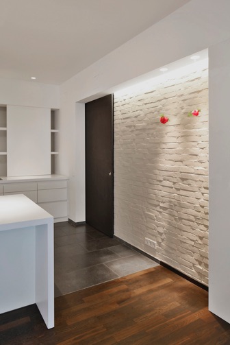 Das Mauerwerk der ehemaligen Außenwand, das nach der Entkernung im Innenraum zu Tage tritt, wird sichtbar belassen und mit Licht inszeniert. Im Gegensatz dazu sind alle neuen Wände und Einbauten scharfkantig und sehr exakt ausgebildet. Der Bodenbelag aus geräucherter Eiche von Kamin- und Esszimmer wird im Wohnraum ergänzt. In der Küche findet sich der Terassenbelag aus Basalt wieder - nur mit einer geschliffenen Oberfläche.