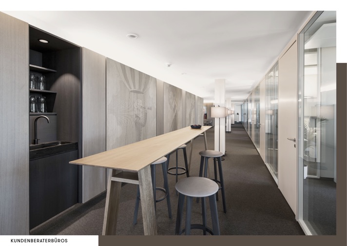 Den inneren, von der Architektur vorgegebenen, Kern umfängt eine multifunktionale Holzwand, die die Corporate Image Bilder in spektakulären Akustografien in den Raum transformiert. Sie birgt zusätzlich zu ihrer akustischen Wirksamkeit zahlreiche funktionale Elemente wie ein Factsheetregal, einen Mineralwasserspender, Schränke für Akten, Vollholzauszüge für Büromaterial, eine Licht- voute und die Vorstandsgarderoben in selbiger Raumzonierung.