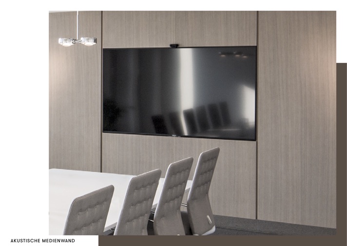 Den inneren, von der Architektur vorgegebenen, Kern umfängt eine multifunktionale Holzwand, die die Corporate Image Bilder in spektakulären Akustografien in den Raum transformiert. Sie birgt zusätzlich zu ihrer akustischen Wirksamkeit zahlreiche funktionale Elemente wie ein Factsheetregal, einen Mineralwasserspender, Schränke für Akten, Vollholzauszüge für Büromaterial, eine Licht- voute und die Vorstandsgarderoben in selbiger Raumzonierung.