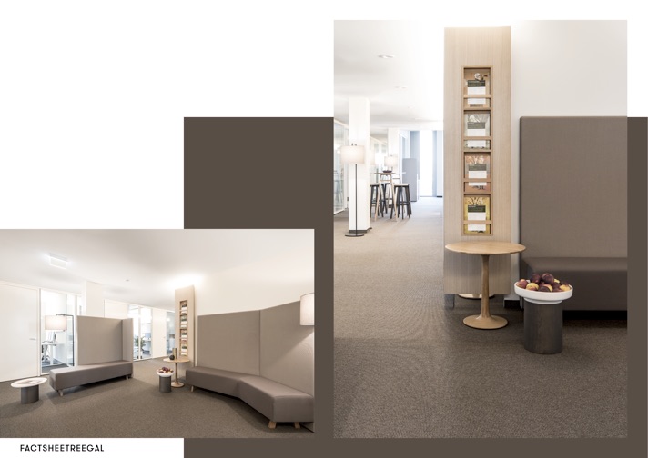 Den inneren, von der Architektur vorgegebenen, Kern umfängt eine multifunktionale Holzwand, die die Corporate Image Bilder in spektakulären Akustografien in den Raum transformiert. Sie birgt zusätzlich zu ihrer akustischen Wirksamkeit zahlreiche funktionale Elemente wie ein Factsheetregal, einen Mineralwasserspender, Schränke für Akten, Vollholzauszüge für Büromaterial, eine Licht- voute und die Vorstandsgarderoben in selbiger Raumzonierung.