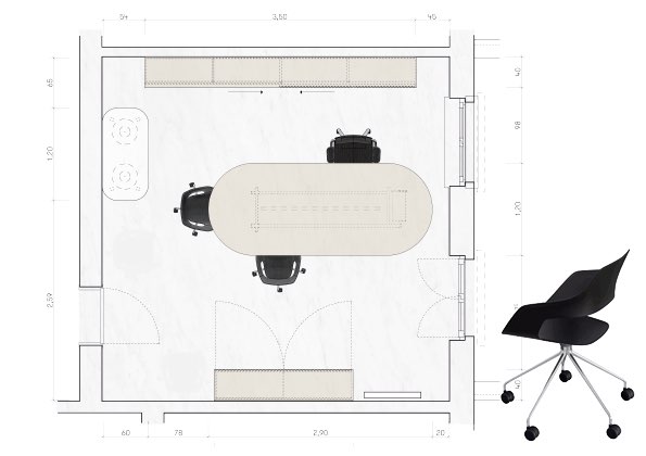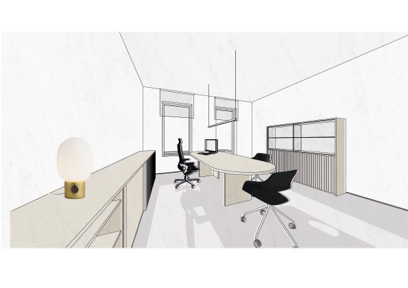 Entwurf der Möbel, Material- und Beleuchtungskonzept