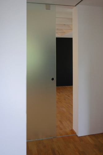 So ergeben sich spannende Ein-, Durch- und Ausblicke, Spiegelungen und Lichtreflexe. Die Küche verschwindet, wenn gewünscht, hinter einer Schiebtür aus schwarzem Tafellack, die auf Bemalungen und Beschriftungen wartet: Liebesbriefe, Rezepte, Einkaufslisten, poetische Eingebungen und kreativer Ausdruck in Form von Text und Bild. Das Bad ist ebenfalls mit einer beschreibbaren Tafellacktür Teil des Raumkontinuums und des Wohnraumes: ein Wohnbad zum Wohlfühlen.
