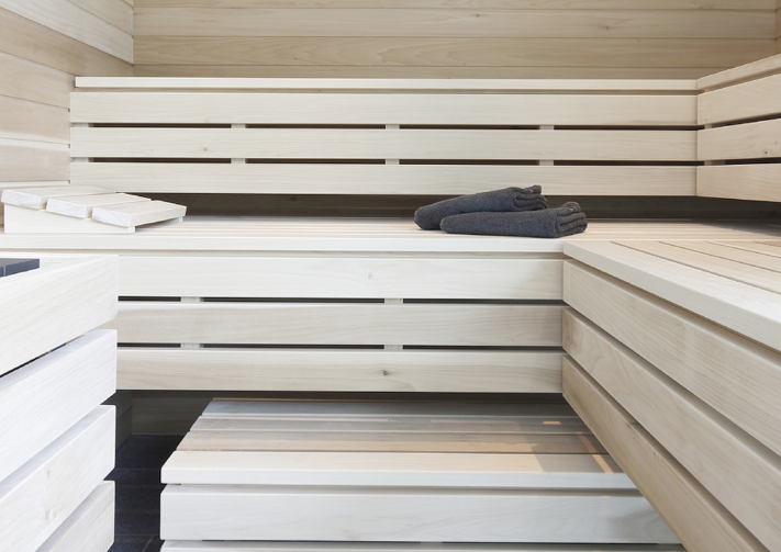Holz und Stein, amerikanisches Whitewood und italienischer Basalt bestimmen in ihrer puren Materialität die Atmosphäre dieser Sauna. Die gradlinigige, schnörkellose Gestaltung und die ursprüngliche Materialität sorgen dafür, dass allein schon die wohltuende, pure Ästhetik Auge und Geist entspannt. Abends tauchen feuchte- und hitzeresistente Downlights den Raum in ein warmes Licht und verwandeln das Gebäude in eine Garten-laterne, die am Ende des Gartens das kleine Wasserbecken des Pools flankiert und beleuchtet.
