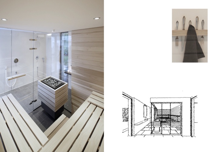 Holz und Stein, amerikanisches Whitewood und italienischer Basalt bestimmen in ihrer puren Materialität die Atmosphäre dieser Sauna. Die gradlinigige, schnörkellose Gestaltung und die ursprüngliche Materialität sorgen dafür, dass allein schon die wohltuende, pure Ästhetik Auge und Geist entspannt. Abends tauchen feuchte- und hitzeresistente Downlights den Raum in ein warmes Licht und verwandeln das Gebäude in eine Garten-laterne, die am Ende des Gartens das kleine Wasserbecken des Pools flankiert und beleuchtet.