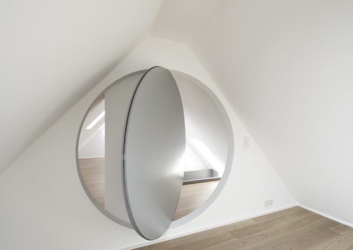 Das Pendant zu dieser Wand ist eine die Galerie abschließende Wand mit der gleichen kreisrunden Öffnung. Obwohl die Galerie erweitert wurde, erlaubt diese Öffnung im darunterliegenden Wohngeschoss immer noch den Blick in den Himmel und profitiert von dem Licht der Dachfenster.