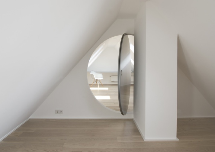 Durch den Umbau, d.h. die Erweiterung der Galerie, und den Ausbau eines Abstellraumes im Spitzboden ist es gelungen, mit einem sehr überschaubaren Budget fast 50qm mehr nutzbaren, sehr licht- und qualitätvollen Wohnraum zu gewinnen. Die Besonderheit des Entwurfs sind zwei Trennwände mit riesiegen kreisrunden Öffnungen.