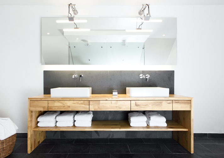 Der Waschtisch aus massiver Robinie bietet Platz für alle notwendigen Badeuntensilien und es entsteht Raum für Freude an fließendem Wasser, Raum für Reinigung, Entspannung und Schönheit.