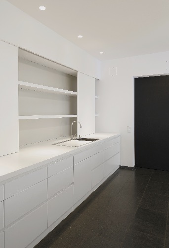 Diese Küche ist eine kollegiale, gemeinschaftliche Küche und wird zusammen mit dem Wohnbereich das Zentrum und der Mittelpunkt des Lebens im Haus. Sie bietet Raum für Bewegung, Tätigkeiten im Sitzen und im Stehen, für Genuss, Zuhören und Zuschauen und wird zur Bühne für das, was in ihr geschieht.