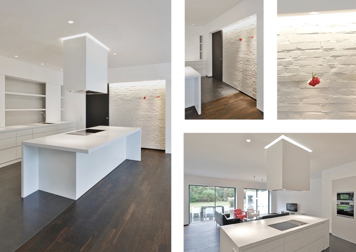 Das Mauerwerk der ehemaligen Außenwand, das nach der Entkernung im Innenraum zu Tage tritt, wird sichtbar belassen und mit Licht inszeniert. Im Gegensatz dazu sind alle neuen Wände und Einbauten scharfkantig und sehr exakt ausgebildet.  Der Bodenbelag aus geräucherter Eiche von Kamin- und Esszimmer wird im Wohnraum ergänzt. In der Küche findet sich der Terassenbelag aus Basalt wieder - nur mit einer geschliffenen Oberfläche.